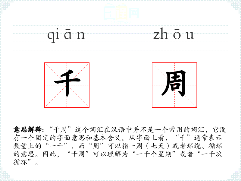 “千周”这个词汇在汉语中并没有特定的词源和历史演变记录,它更多是一个组合词,由“千”和“周”两个常用词汇组成。
