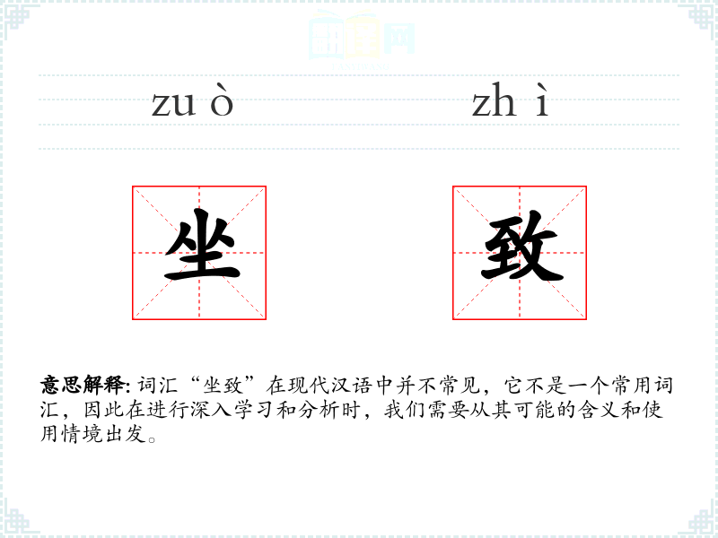 词汇“坐致”在现代汉语中并不常见,它不是一个常用词汇,因此在进行深入学*和分析时,我们需要从其可能的含义和使用情境出发。