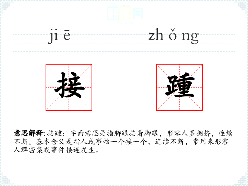 接踵:字面意思是指脚跟接着脚跟,形容人多拥挤,连续不断。基本含义是指人或事物一个接一个,连续不断,常用来形容人群密集或**接连发生。