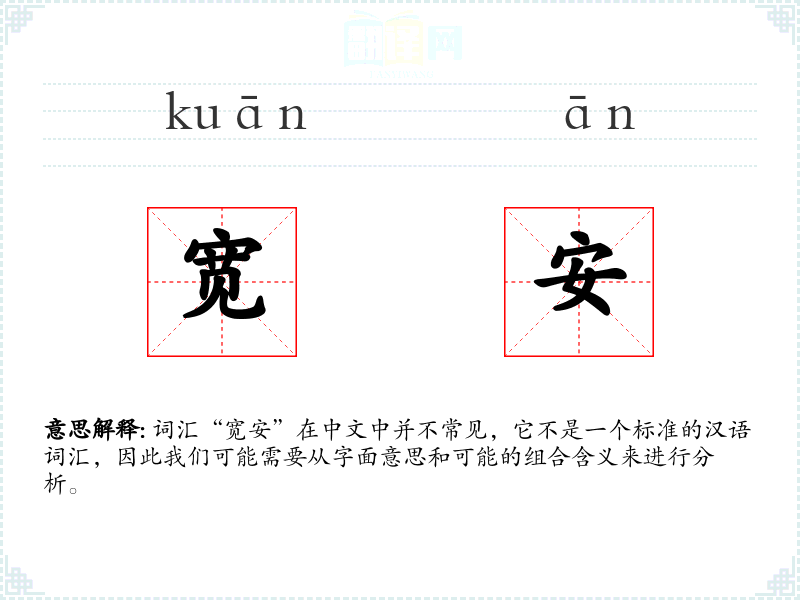 词汇“宽安”在中文中并不常见,它不是一个标准的汉语词汇,因此我们可能需要从字面意思和可能的组合含义来进行分析。