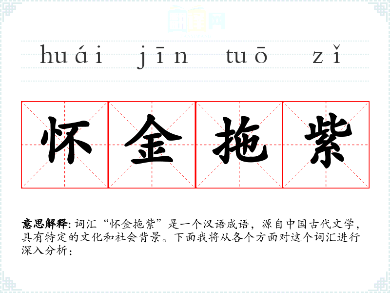 词汇“怀金拖紫”是一个汉语成语,源自**古代文学,具有特定的文化和社会背景。下面我将从各个方面对这个词汇进行深入分析: