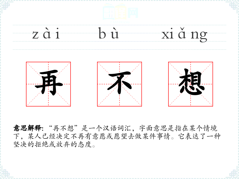 “再不想”是由“再”和“不想”两个词组合而成。在古代汉语中,“再”常表示“再次”或“重复”,而“不想”则表示“不愿意”或“不希望”。随着语言的发展,这两个词结合形成了表达坚决拒绝的短语。