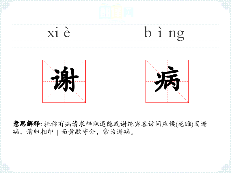 托称有病请求辞职退隐或谢绝宾客访问应侯(范雎)因谢病,请归相印|而黄歇守舍,常为谢病。