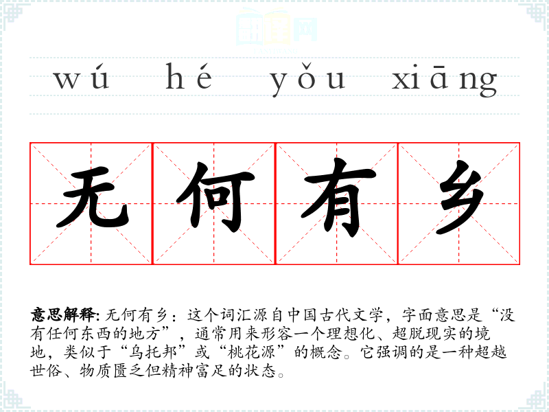 无何有乡:这个词汇源自**古代文学,字面意思是“没有任何东西的地方”,通常用来形容一个理想化、超脱现实的境地,类似于“乌托邦”或“桃花源”的概念。它强调的是一种超越世俗、物质匮乏但精神富足的状态。