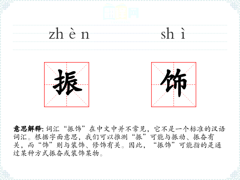 词汇“振饰”在中文中并不常见,它不是一个标准的汉语词汇。根据字面意思,我们可以推测“振”可能与振动、振奋有关,而“饰”则与装饰、修饰有关。因此,“振饰”可能指的是通过某种方式振奋或装饰某物。