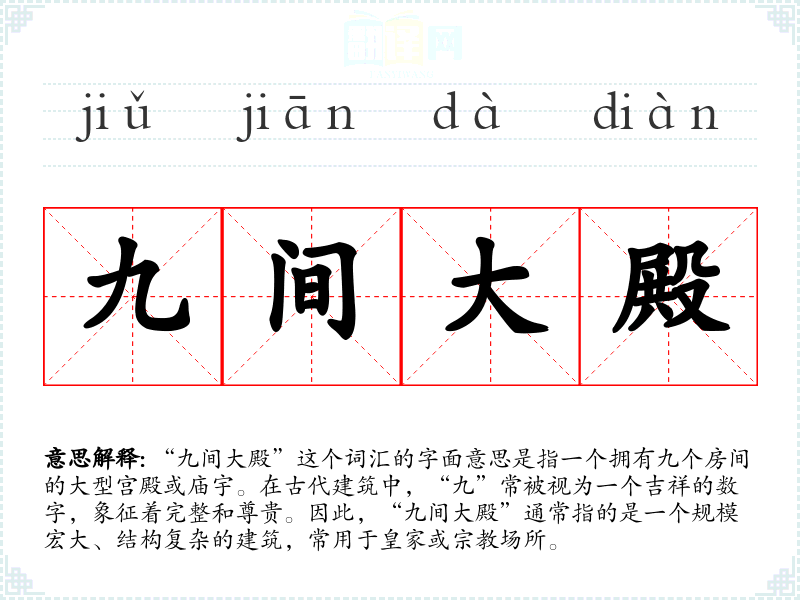 “九间大殿”这个词汇的字面意思是指一个拥有九个房间的大型宫殿或庙宇。在古代建筑中,“九”常被视为一个吉祥的数字,象征着完整和尊贵。因此,“九间大殿”通常指的是一个规模宏大、结构复杂的建筑,常用于皇家或**场所。