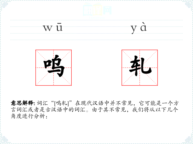 词汇“[呜轧]”在现代汉语中并不常见,它可能是一个方言词汇或者是古汉语中的词汇。由于其不常见,我们将从以下几个角度进行分析: