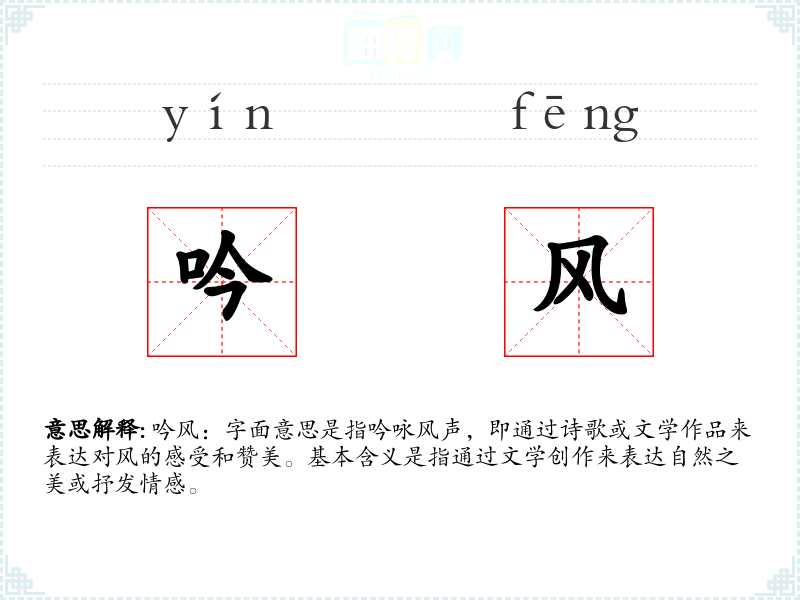 文学语境:在文学作品中,“吟风”常用来形容诗人或文人通过诗歌来表达对自然风光的赞美,如“吟风弄月”。 口语语境:在日常口语中,“吟风”可能不太常用,但在某些文艺或古风的场合,人们可能会用这个词来形容某人的文学创作或表达方式。 专业领域:在文学研究或诗歌创作领域,“吟风”可能被用来讨论诗歌的主题或风格。
