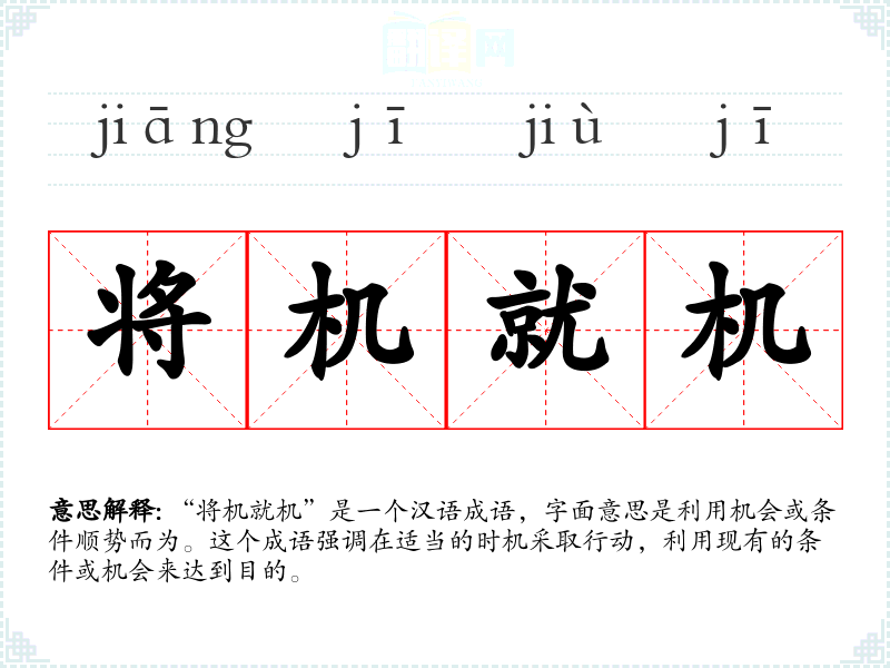 “将机就机”是一个汉语成语,字面意思是利用机会或条件顺势而为。这个成语强调在适当的时机采取行动,利用现有的条件或机会来达到目的。