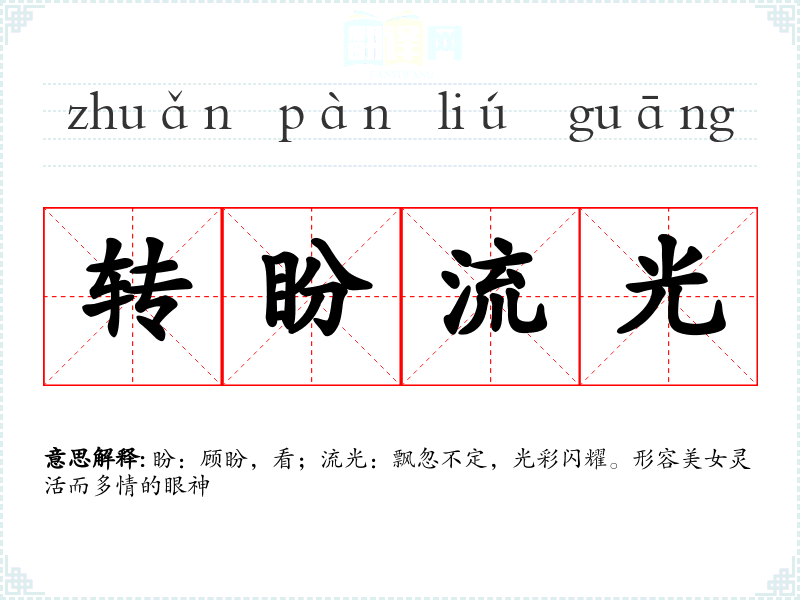 盼:顾盼,看;流光:飘忽不定,光彩闪耀。形容美女灵活而多情的眼神