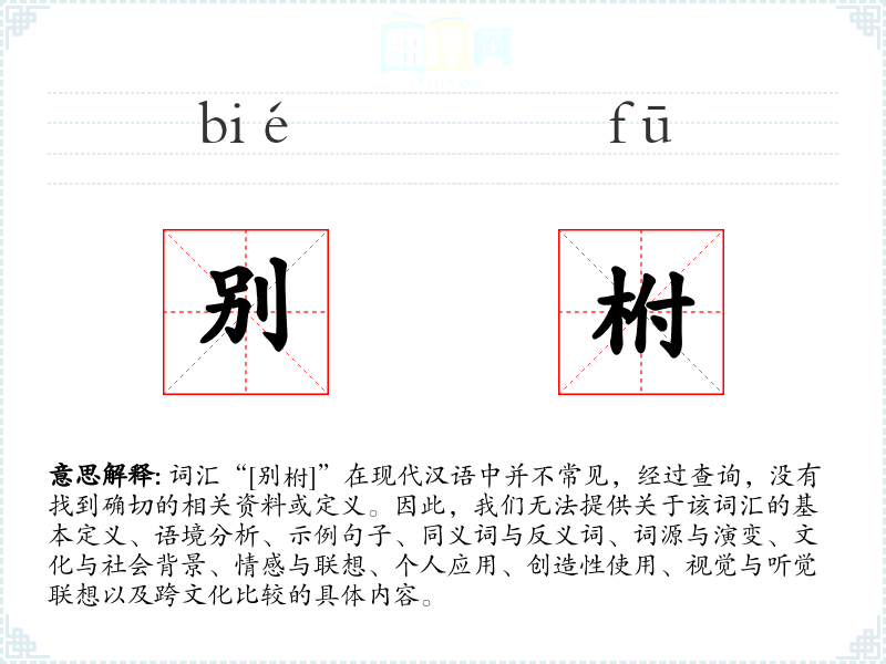 词汇“[别柎]”在现代汉语中并不常见,经过查询,没有找到确切的相关资料或定义。因此,我们无法提供关于该词汇的基本定义、语境分析、示例句子、同义词与反义词、词源与演变、文化与社会背景、情感与联想、个人应用、创造性使用、视觉与听觉联想以及跨文化比较的具体内容。