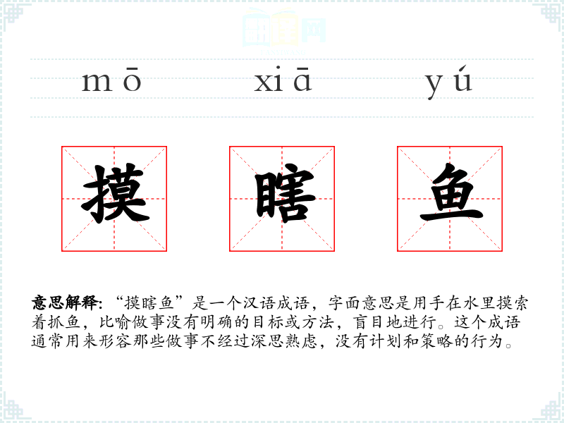 “摸瞎鱼”是一个汉语成语,字面意思是用手在水里摸索着抓鱼,比喻做事没有明确的目标或方法,盲目地进行。这个成语通常用来形容那些做事不经过深思熟虑,没有计划和策略的行为。