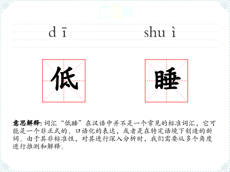 “低睡”字面意思可能是指睡眠的深度较浅,或者是指在较低的位置或状态下睡觉。基本含义可能与睡眠质量不高、休息不充分有关。