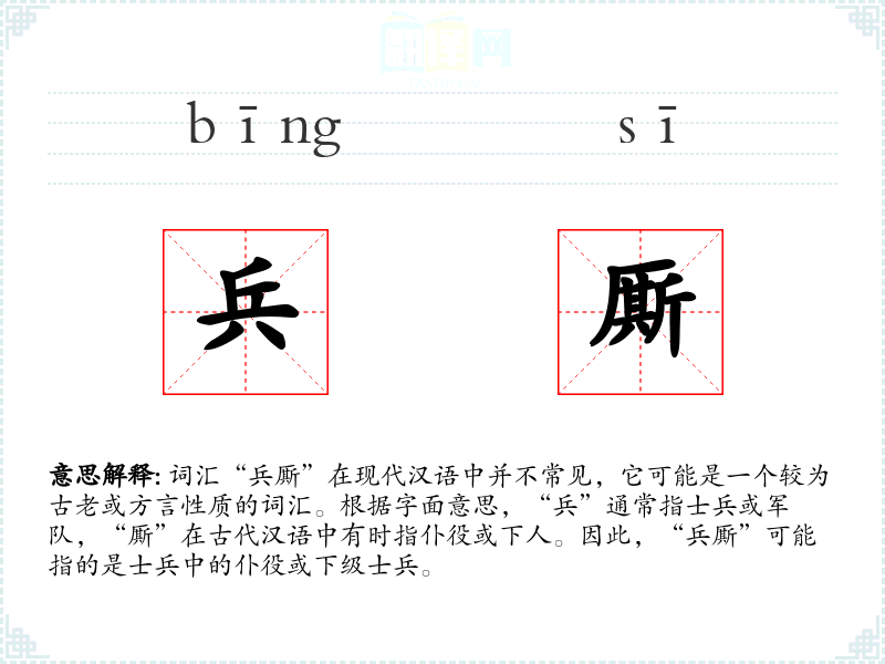 - 词源:“兵”和“厮”都是古代汉语词汇,组合起来形成“兵厮”。