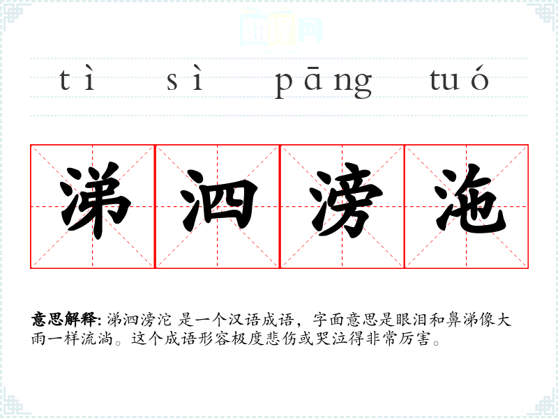 涕泗滂沱 是一个汉语成语,字面意思是眼泪和鼻涕像大雨一样流淌。这个成语形容极度悲伤或哭泣得非常厉害。