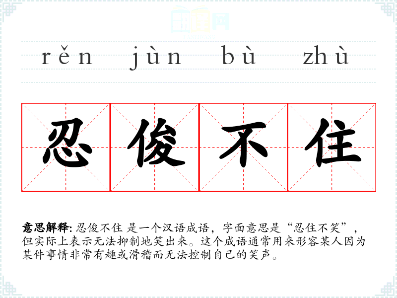 忍俊不住 是一个汉语成语,字面意思是“忍住不笑”,但实际上表示无法抑制地笑出来。这个成语通常用来形容某人因为某件事情非常有趣或滑稽而无法控制自己的笑声。