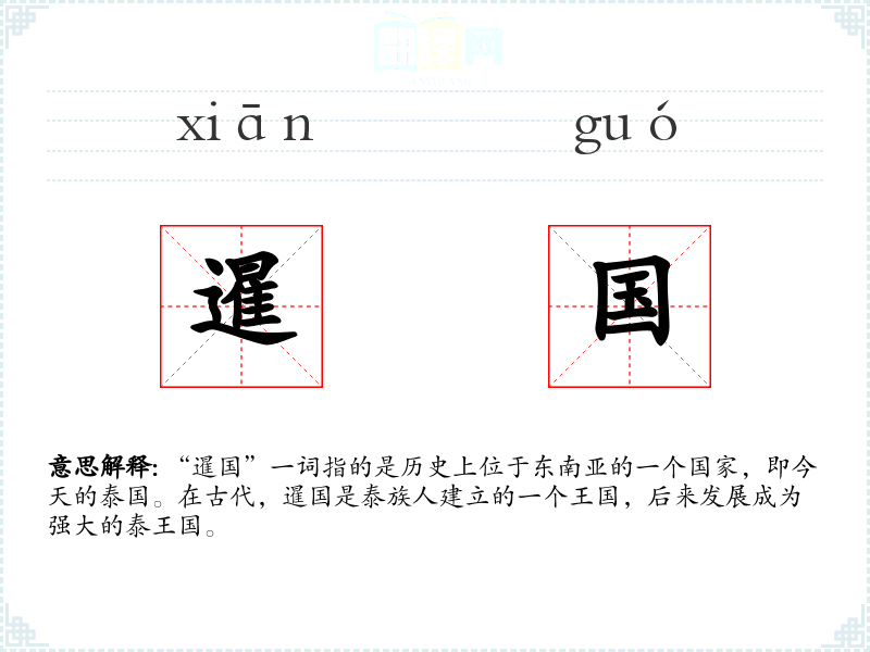 同义词:泰国、泰王国、暹罗(Siam) 反义词:这个词没有直接的反义词,但如果要表达与“暹国”相对的概念,可能是指西方国家或其他非东南亚地区。