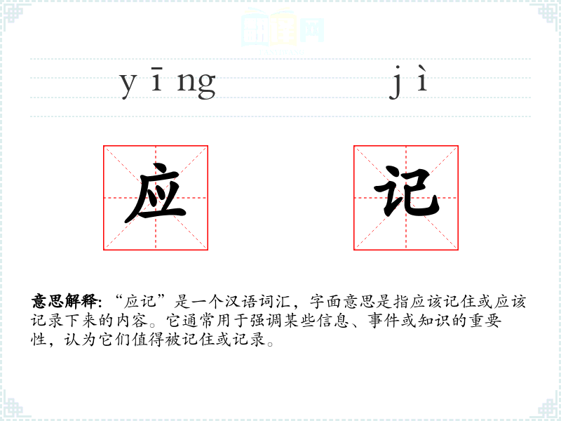 - 口语:在日常对话中,“应记”可能用于提醒对方记住某件事情,例如:“这个重要的日期你应记下来。”