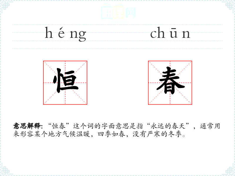 “恒春”这个词的字面意思是指“永远的春天”,通常用来形容某个地方气候温暖,四季如春,没有严寒的冬季。