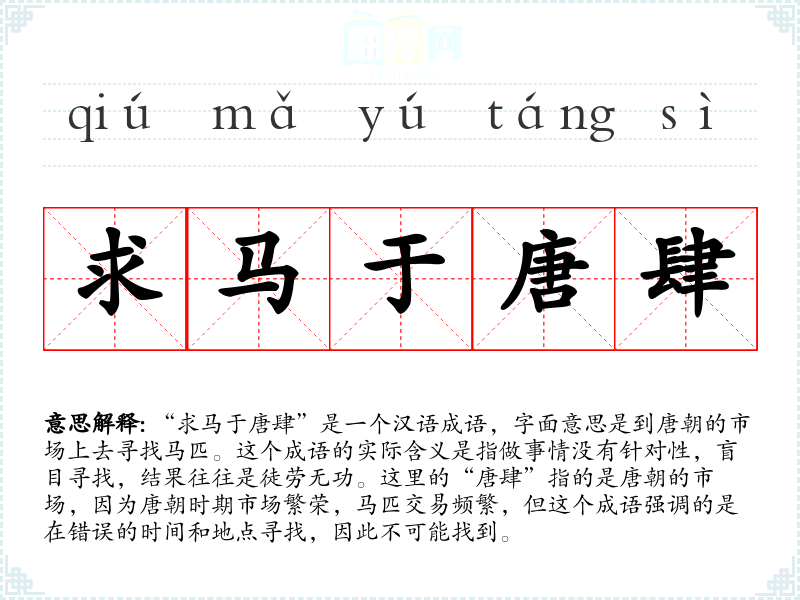 这个成语出自《左传·宣公十五年》:“求马唐肆,非所求也。”原意是指在错误的地方寻找马匹,后来逐渐演变为比喻做事没有针对性,盲目行动。
