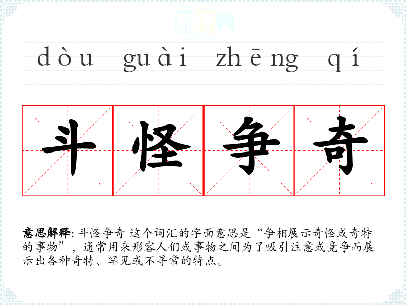 斗怪争奇 这个词汇的字面意思是“争相展示奇怪或奇特的事物”,通常用来形容人们或事物之间为了吸引注意或竞争而展示出各种奇特、罕见或不寻常的特点。