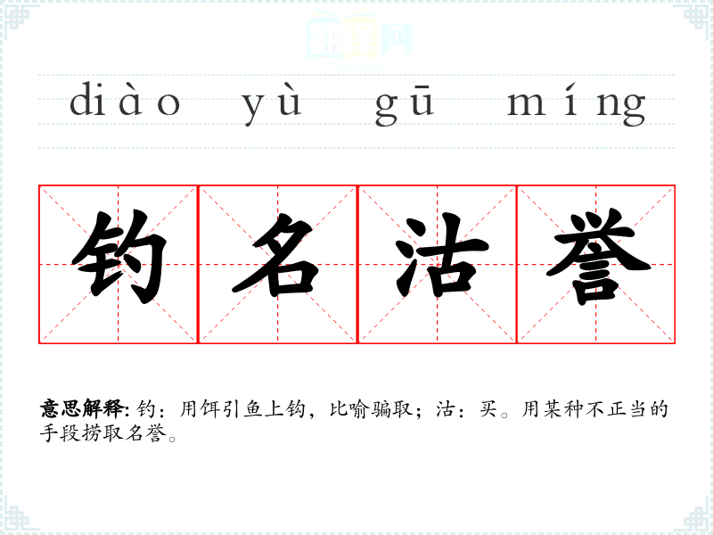 钓:用饵引鱼上钩,比喻骗取;沽:买。用某种不正当的手段捞取名誉。