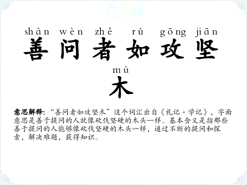 “善问者如攻坚木”这个词汇出自《礼记·学记》,字面意思是善于提问的人就像砍伐坚硬的木头一样。基本含义是指那些善于提问的人能够像砍伐坚硬的木头一样,通过不断的提问和探索,解决难题,获得知识。