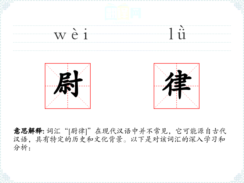 词汇“[尉律]”在现代汉语中并不常见,它可能源自古代汉语,具有特定的历史和文化背景。以下是对该词汇的深入学*和分析: