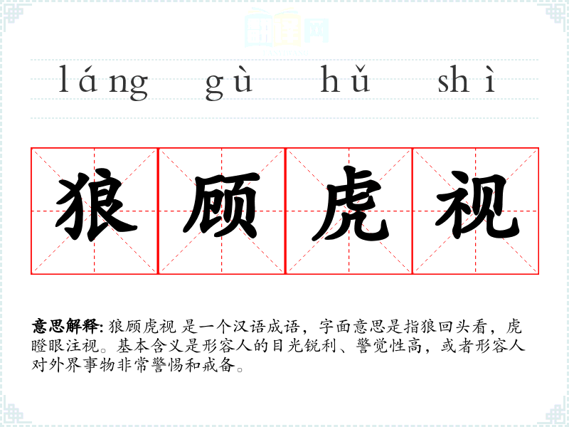 狼顾虎视 是一个汉语成语,字面意思是指狼回头看,虎瞪眼注视。基本含义是形容人的目光锐利、警觉性高,或者形容人对外界事物非常警惕和戒备。