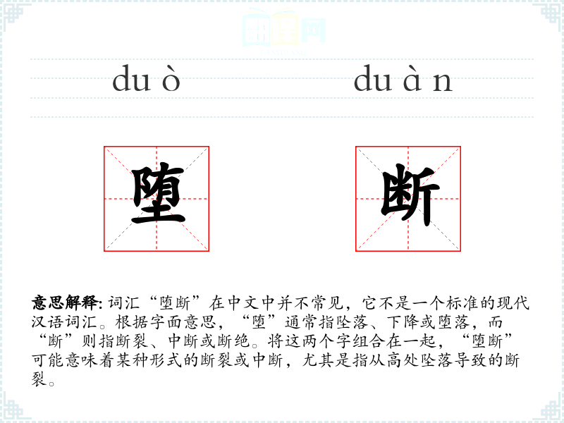 由于“堕断”不是一个常用词汇,其词源和历史演变不详。它可能是由两个常用汉字组合而成的新词,用于特定语境。