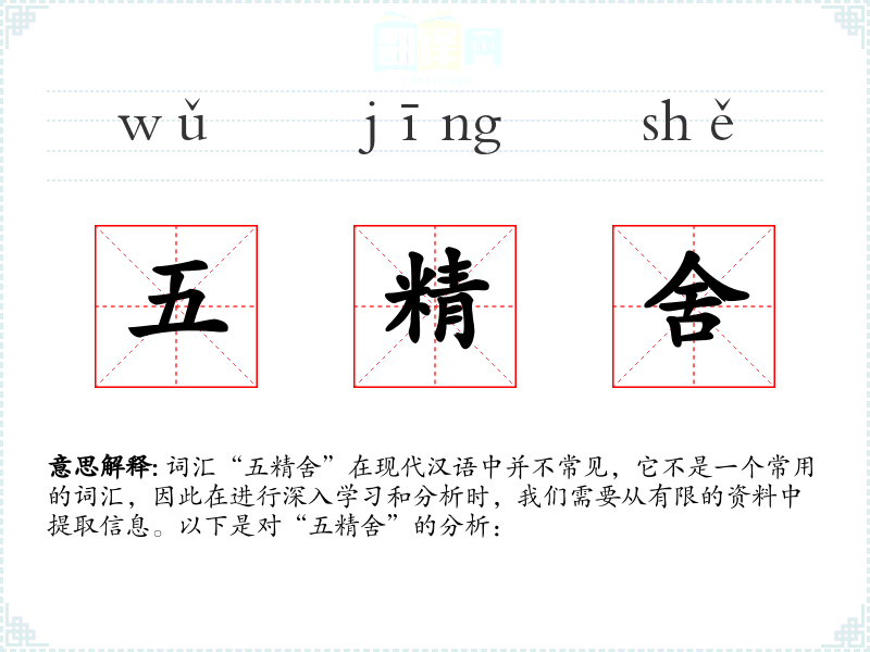 词汇“五精舍”在现代汉语中并不常见,它不是一个常用的词汇,因此在进行深入学*和分析时,我们需要从有限的资料中提取信息。以下是对“五精舍”的分析: