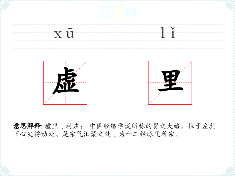 墟里﹐村庄; 中医经络学说所称的胃之大络。位于左乳下心尖搏动处。是宗气汇聚之处﹐为十二经脉气所宗。