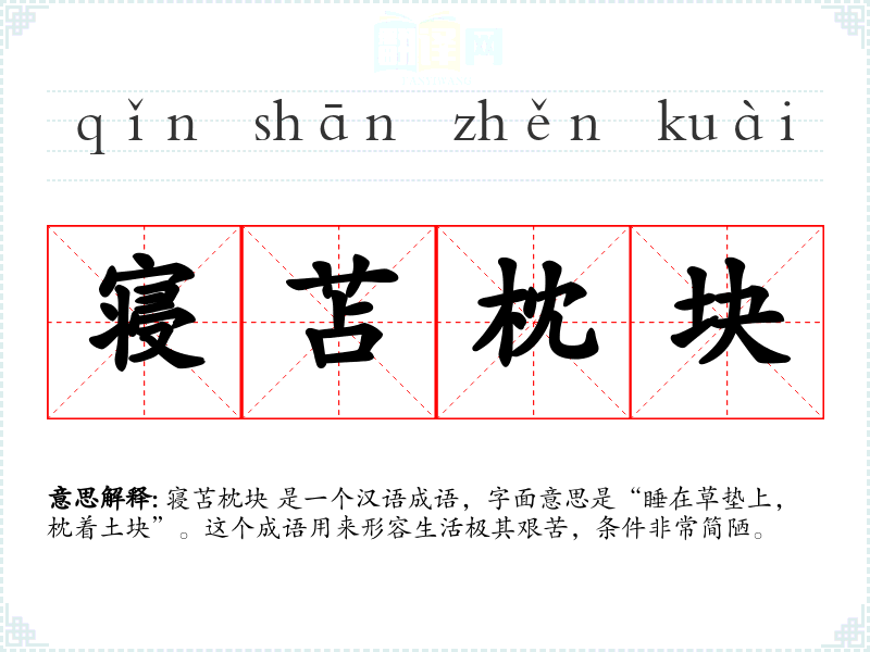 寝苫枕块 是一个汉语成语,字面意思是“睡在草垫上,枕着土块”。这个成语用来形容生活极其艰苦,条件非常简陋。