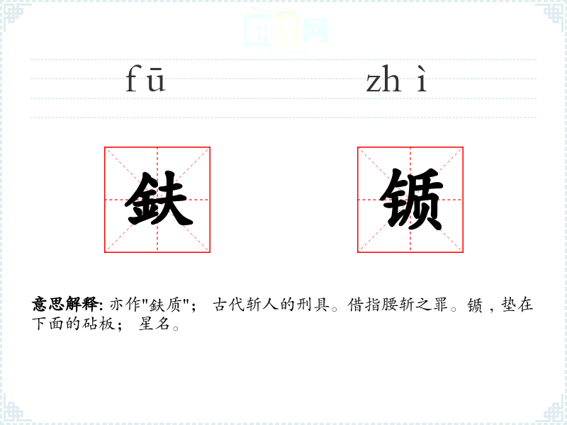 亦作"鈇质"; 古代斩人的刑具。借指腰斩之罪。锧﹐垫在下面的砧板; 星名。