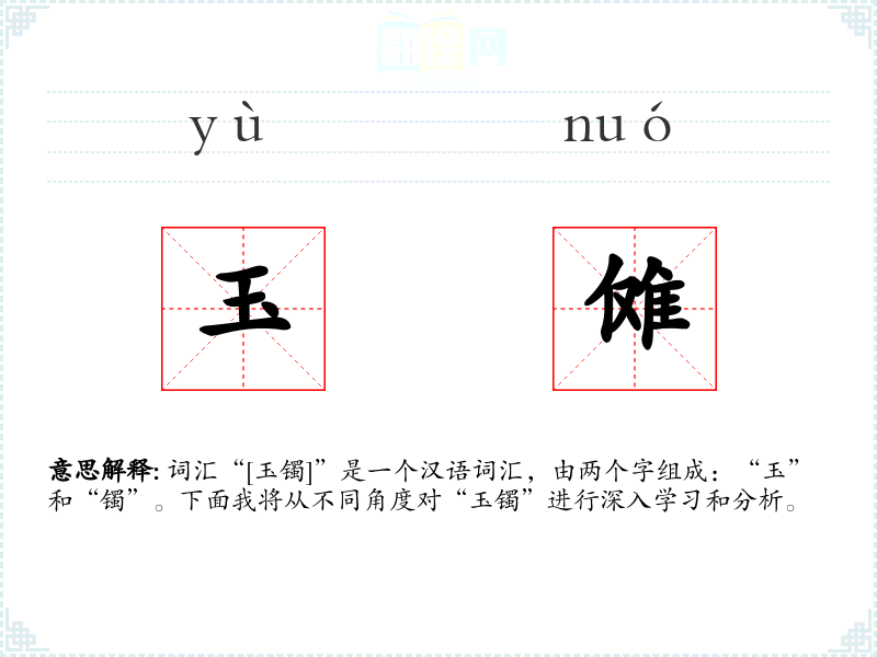 - 字面意思:“玉”指的是一种珍贵的矿石,常用来制作装饰品;“镯”是一种戴在手腕上的环形装饰品。