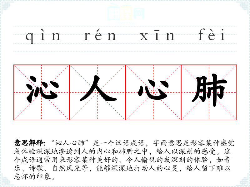 在文学作品中,“沁人心肺”常用来形容诗歌、音乐或自然景观的美妙,如“这首诗的意境沁人心肺,让人久久不能忘怀。”在口语中,这个成语也可以用来形容某种深刻的体验或感受,如“那次旅行的美景真是沁人心肺,至今记忆犹新。”在专业领域,如音乐评论中,可能会用这个成语来形容某首歌曲或演奏的深刻感染力。