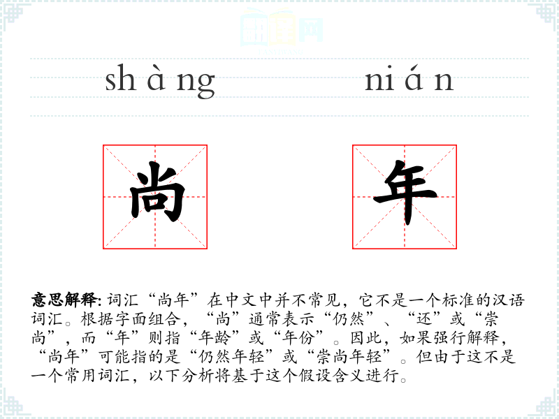 词汇“尚年”在中文中并不常见,它不是一个标准的汉语词汇。根据字面组合,“尚”通常表示“仍然”、“还”或“崇尚”,而“年”则指“年龄”或“年份”。因此,如果强行解释,“尚年”可能指的是“仍然年轻”或“崇尚年轻”。但由于这不是一个常用词汇,以下分析将基于这个假设含义进行。