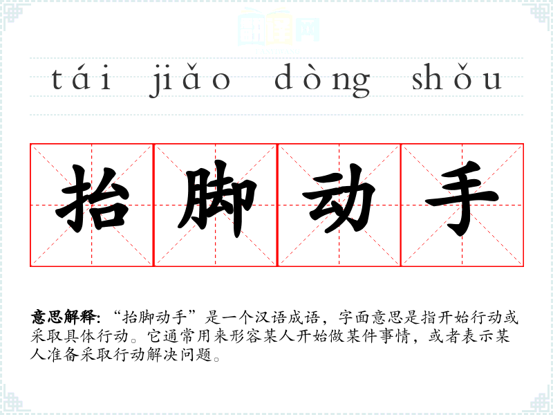 “抬脚动手”这个成语的词源较为直接,由“抬脚”和“动手”两个动作组合而成,形象地描述了开始行动的状态。在汉语中,类似的成语还有“动手动脚”,但含义略有不同,主要指行为粗鲁或不礼貌。