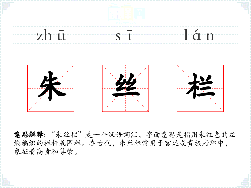 “朱丝栏”是一个汉语词汇,字面意思是指用朱红色的丝线编织的栏杆或围栏。在古代,朱丝栏常用于宫廷或贵族府邸中,象征着高贵和尊荣。
