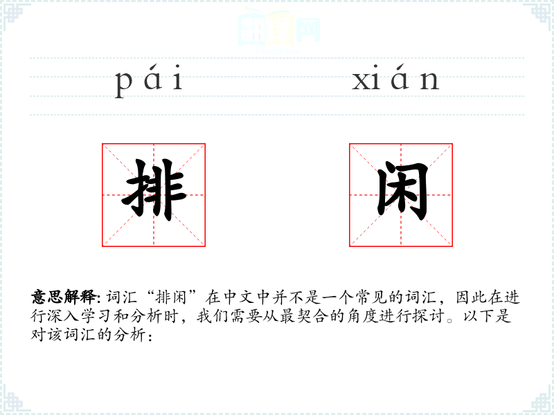 词汇“排闲”在中文中并不是一个常见的词汇,因此在进行深入学习和分析时,我们需要从最契合的角度进行探讨。以下是对该词汇的分析: