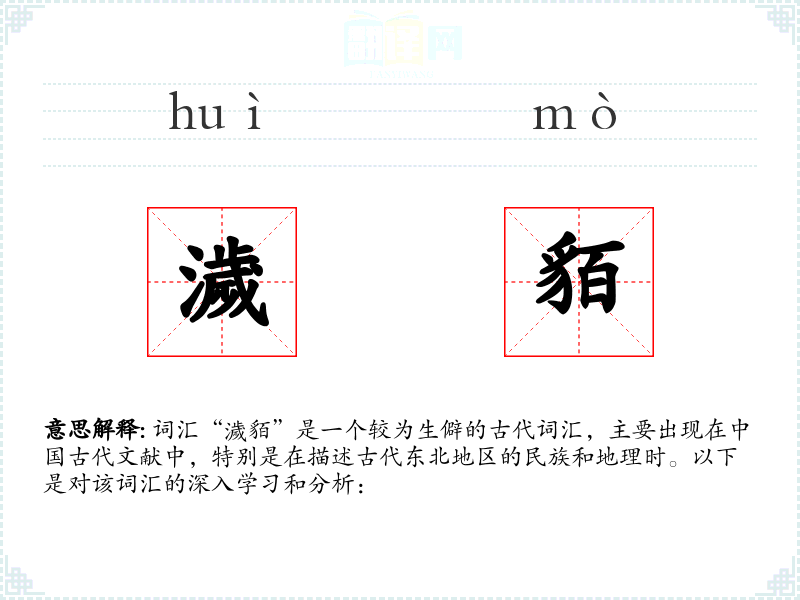 词汇“濊貊”是一个较为生僻的古代词汇,主要出现在*古代文献中,特别是在描述古代东北地区的民族和地理时。以下是对该词汇的深入学和分析: