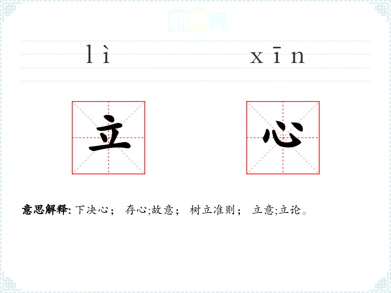 下决心; 存心;故意; 树立准则; 立意;立论。