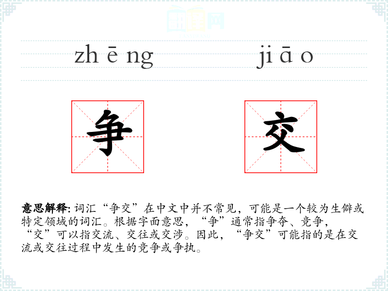 词汇“争交”在中文中并不常见,可能是一个较为生僻或特定领域的词汇。根据字面意思,“争”通常指争夺、竞争,“交”可以指交流、交往或交涉。因此,“争交”可能指的是在交流或交往过程中发生的竞争或争执。