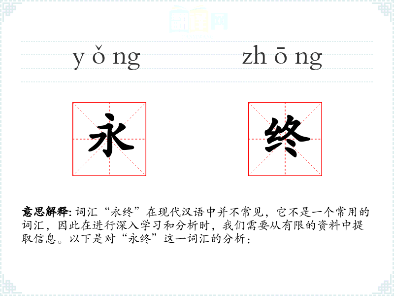 词汇“永终”在现代汉语中并不常见,它不是一个常用的词汇,因此在进行深入学*和分析时,我们需要从有限的资料中提取信息。以下是对“永终”这一词汇的分析: