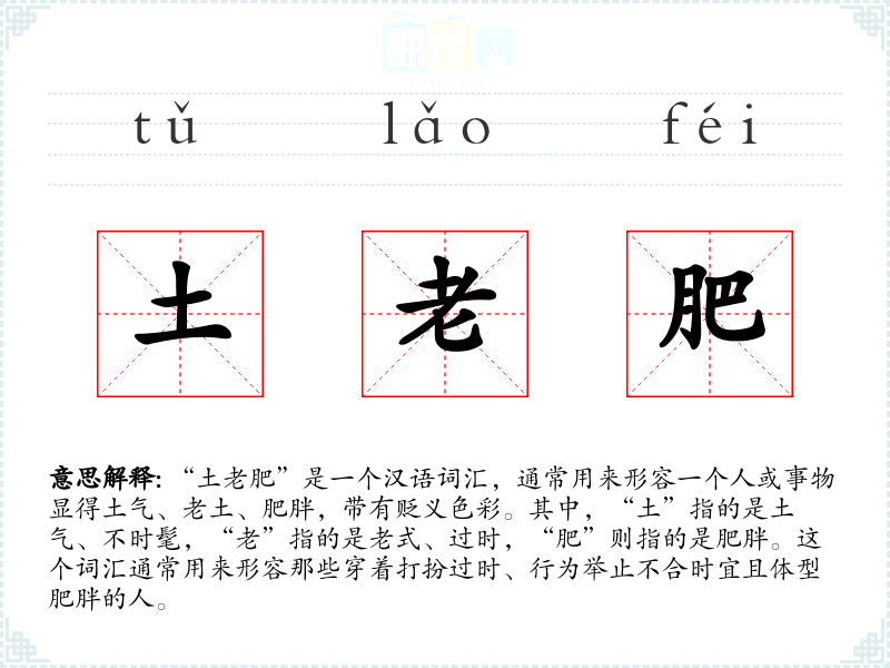 “土老肥”是一个汉语词汇,通常用来形容一个人或事物显得土气、老土、肥胖,带有贬义色彩。其中,“土”指的是土气、不时髦,“老”指的是老式、过时,“肥”则指的是肥胖。这个词汇通常用来形容那些穿着打扮过时、行为举止不合时宜且体型肥胖的人。