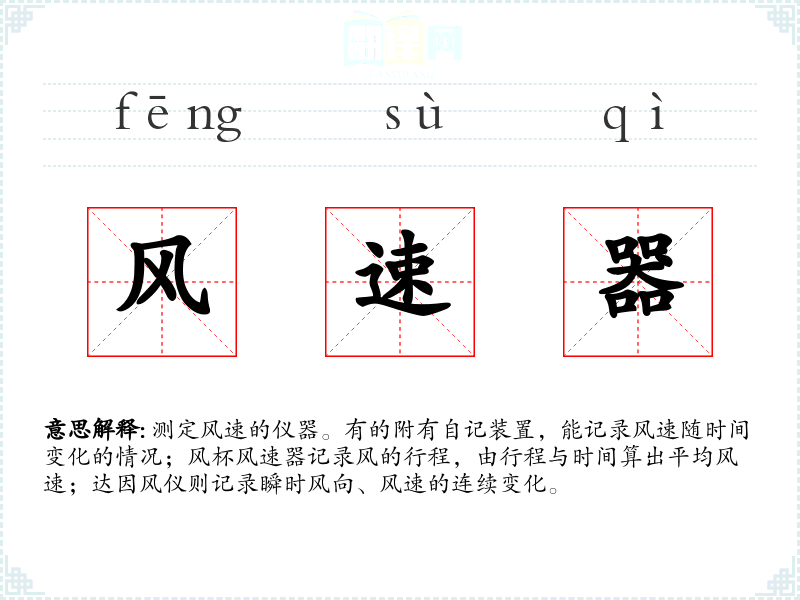 测定风速的仪器。有的附有自记装置,能记录风速随时间变化的情况;风杯风速器记录风的行程,由行程与时间算出平均风速;达因风仪则记录瞬时风向、风速的连续变化。