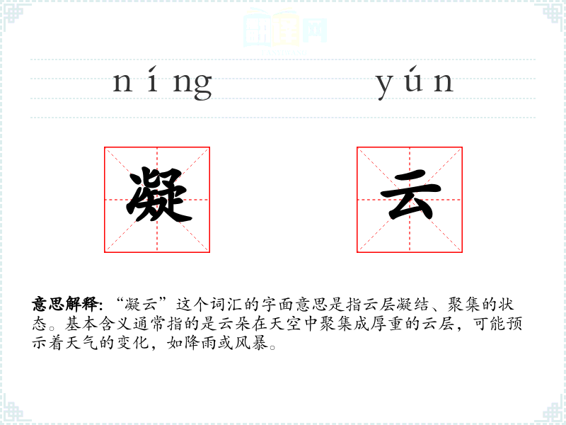“凝云”这个词汇的字面意思是指云层凝结、聚集的状态。基本含义通常指的是云朵在天空中聚集成厚重的云层,可能预示着天气的变化,如降雨或风暴。
