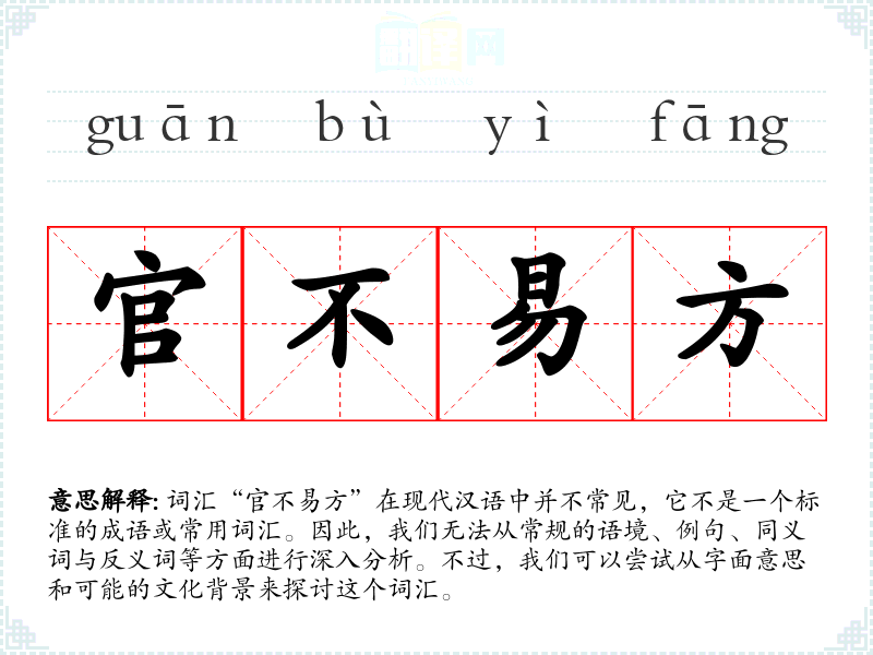 由于“官不易方”不是一个常用词汇,我们无法提供更多的分析内容,如例句、同义词与反义词、个人应用、创造性使用、视觉与听觉联想和跨文化比较等。