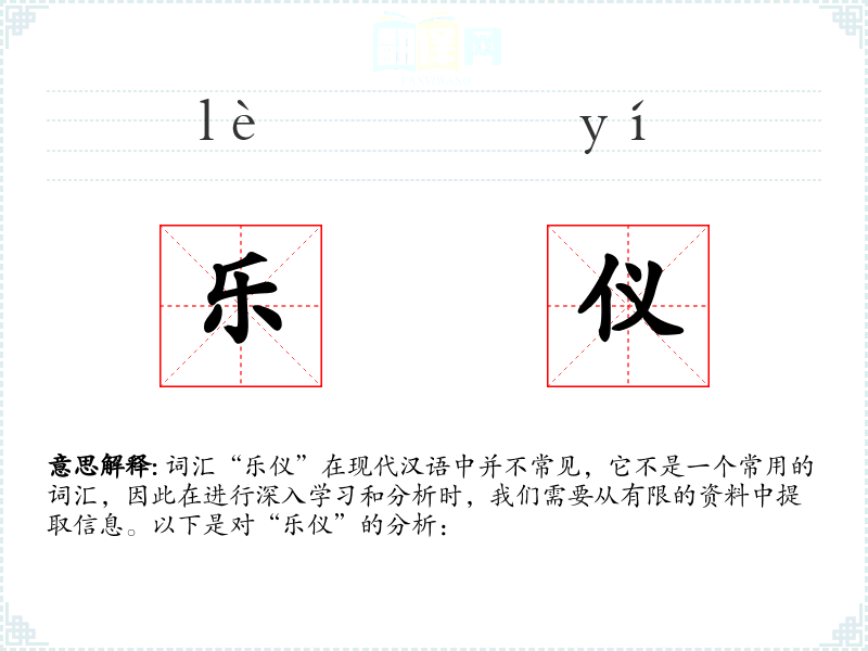 词汇“乐仪”在现代汉语中并不常见,它不是一个常用的词汇,因此在进行深入学*和分析时,我们需要从有限的资料中提取信息。以下是对“乐仪”的分析: