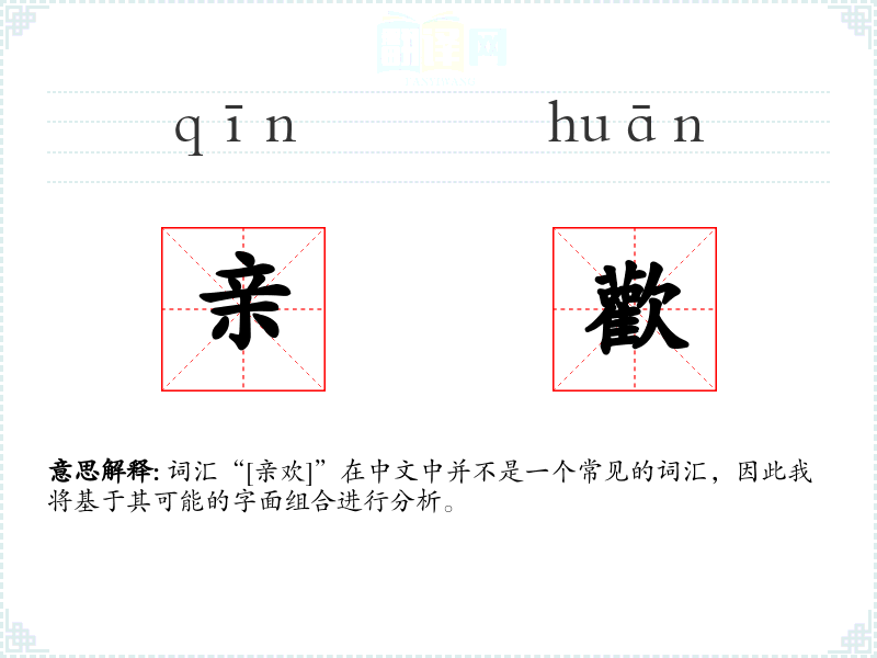 词汇“[亲欢]”在中文中并不是一个常见的词汇,因此我将基于其可能的字面组合进行分析。